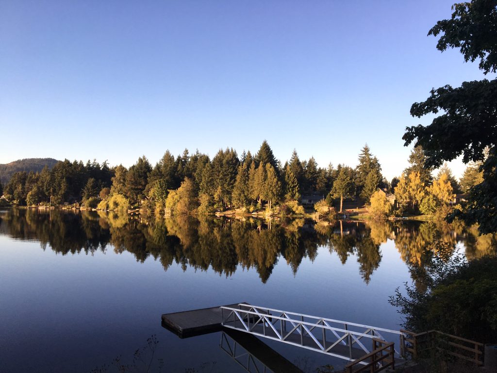 I grabbed on to mine and hauled myself to the nearest trail, one lined with towering Douglas firs and magnificent arbutus trees. I walked slowly, my feet heavy like bricks and paused to gaze out over the glistening, glass lake. I sipped my dark roast with two creams and listened to the melody of chirping birds.